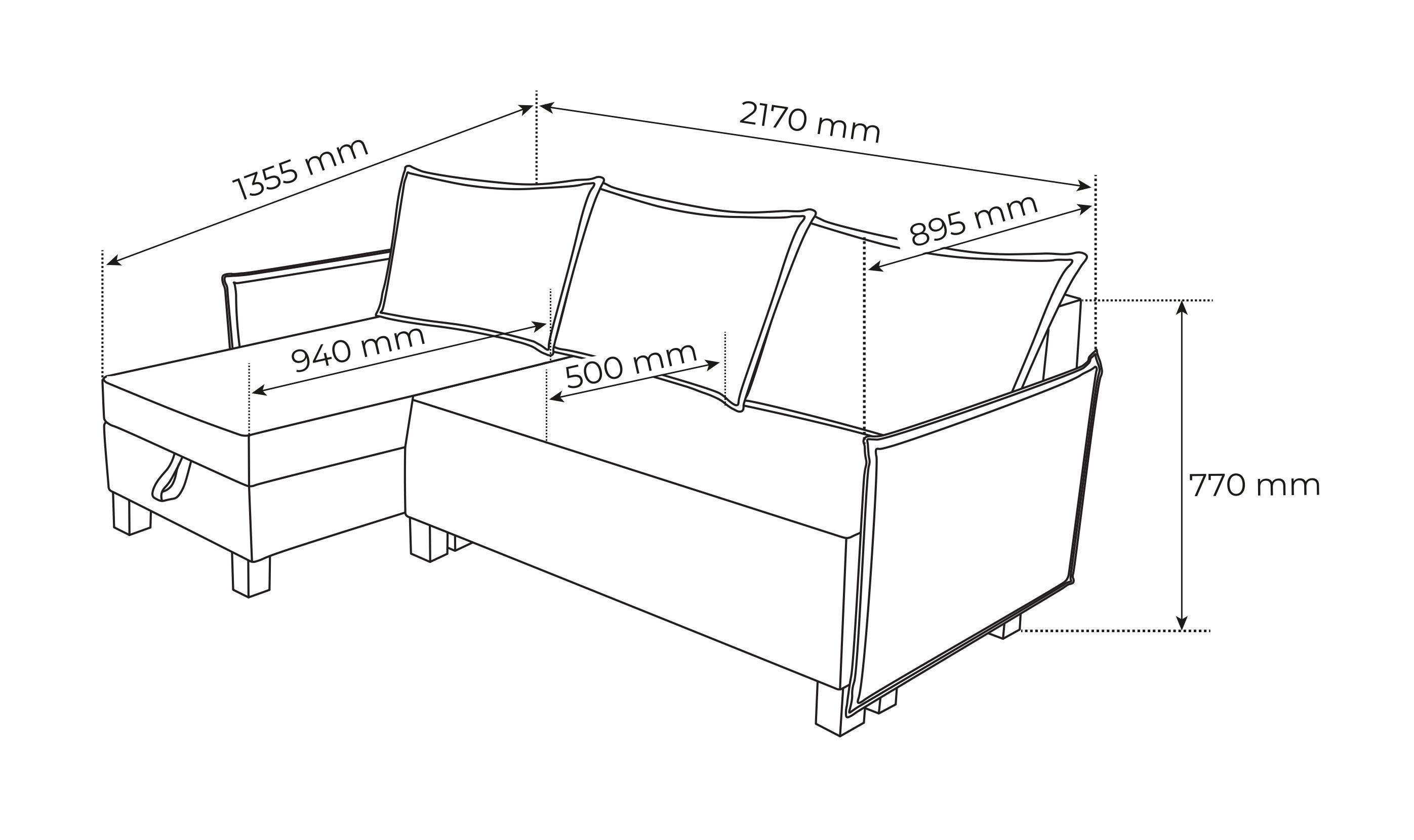Ящик для белья под основным сидением и в угловой части 128х58х18/66х113х18 см.