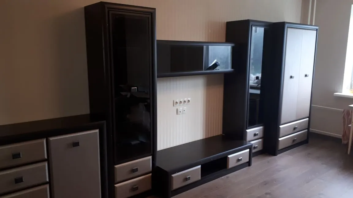 Купили с супругой комплект мебели в гостиную. Красивый, стильный дизайн и функциональность были главными факторами. Несмотря на кажущуюся громоздкость, комплект вовсе не выглядит так в интерьере гостиной. Хорошо, что место отведено для всего самого необходимого-телевизор, книги и прочие нужные мелочи.