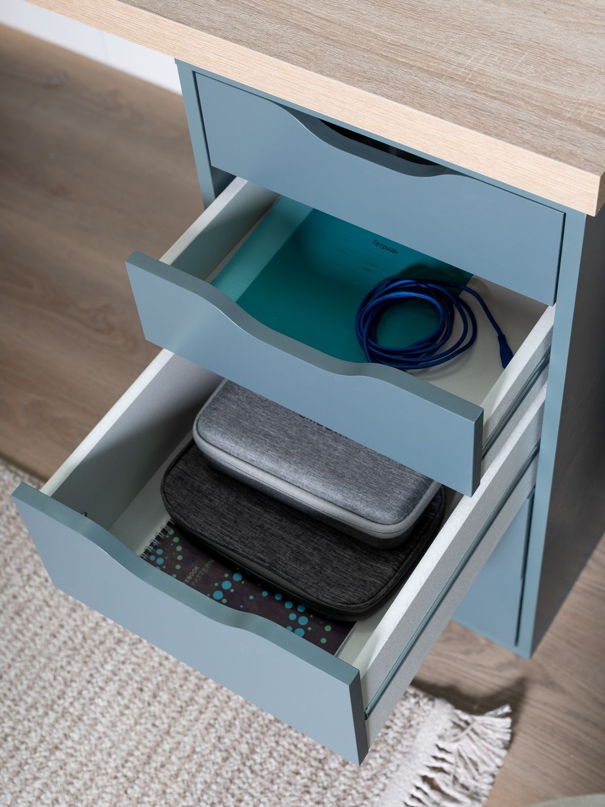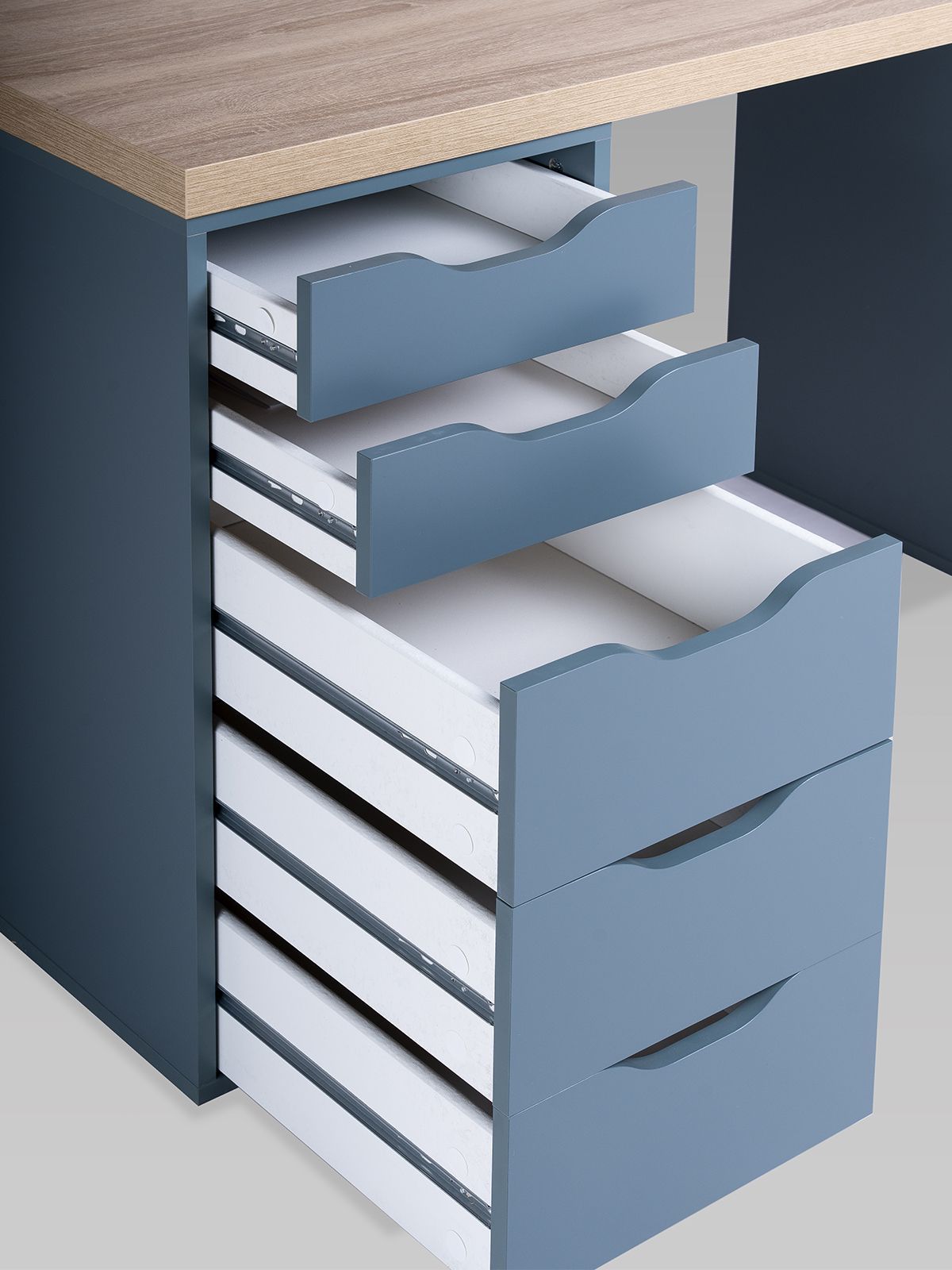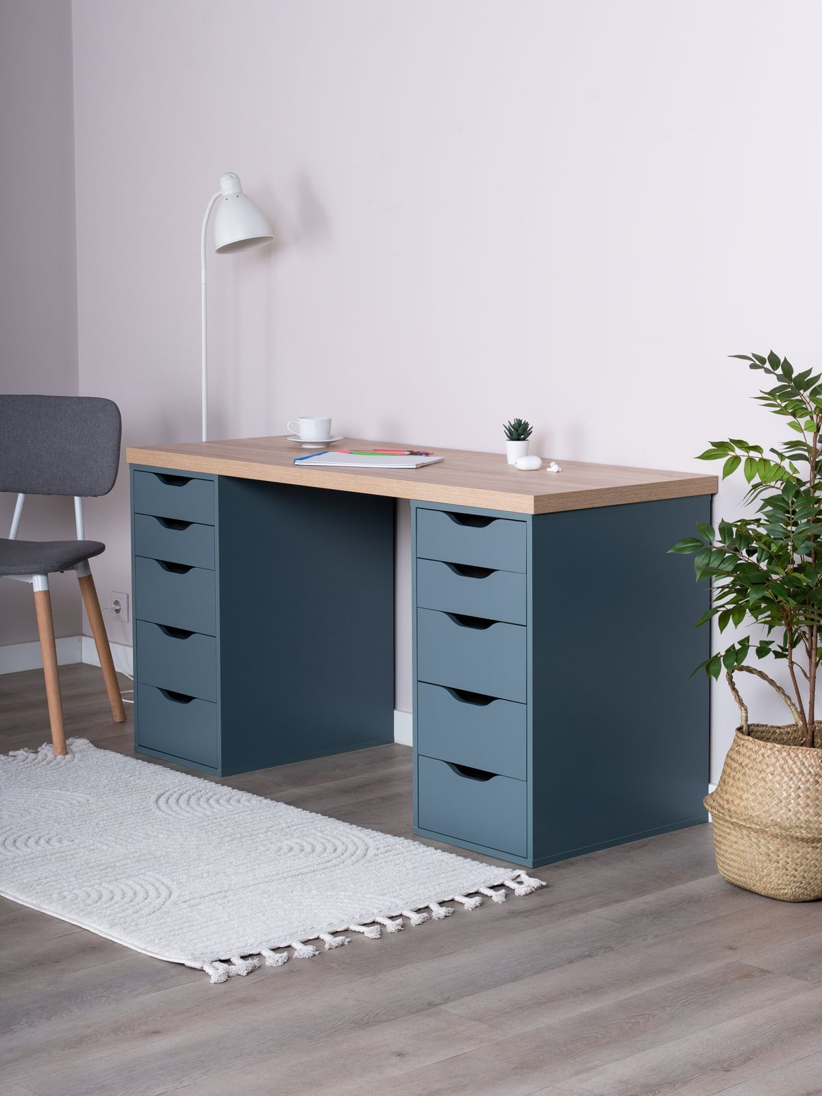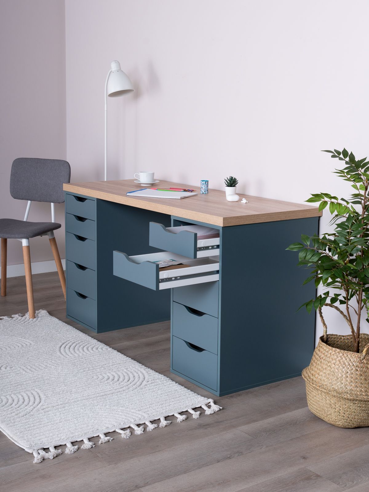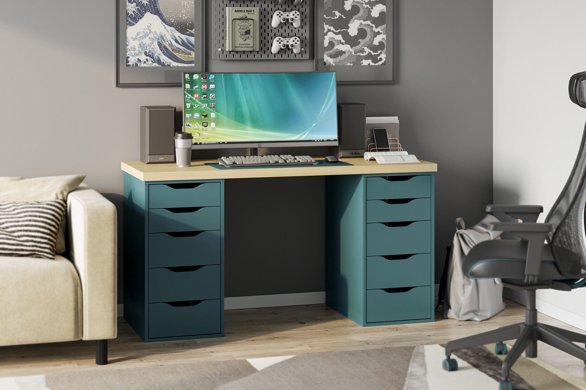 Стол письменный Ингар, 10 ящиков, 140х75х55 см, серо-бирюзовый, столешница дуб беленый