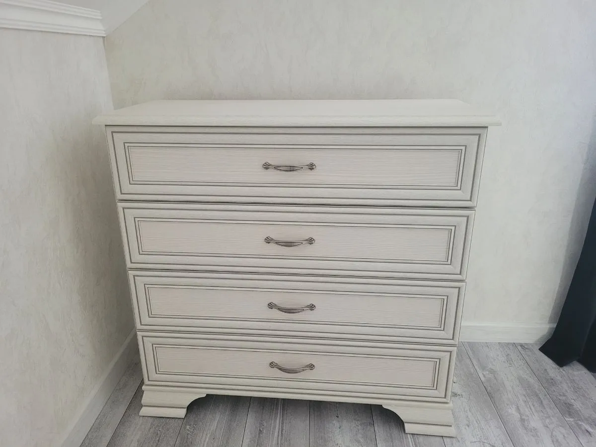 Нежный кремовый цвет вудлайн и отчетливая древесная текстура смотрится шикарно на фоне рамочно-филенчатых фасадов и заставляет любоваться внешним совершенством изделия. В нем гармонично все, от правильно подобранных размеров до внешнего покрытия. Матовая поверхность комода не сохраняет отпечатки пальцев и не создает бликов.