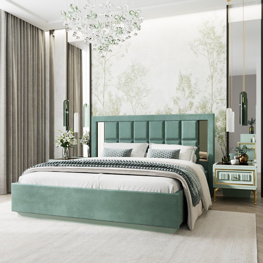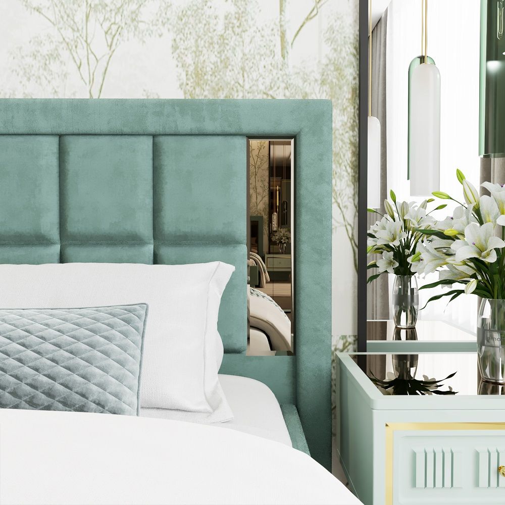 Изголовье: Спинка в велюре, по бокам зеркальные вставки с фацетом, с тыльной стороны кровати (сзади) материал ЛДСП;