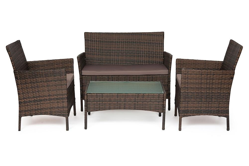 Материал: каркас - металл, спинка и сиденье - полиротанг, столешница - стекло, мягкие элементы - ткань полиэстер с пропиткой от дождя. Размеры: диван - 108x62x83 см, кресло - 60x62x83 см, столик - 80x48x39 см Страна-производитель: Китай