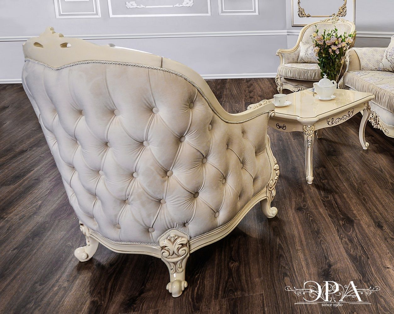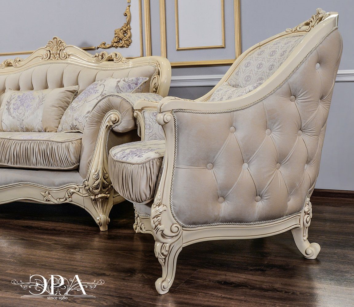 Кресло «Мона Лиза» в цвете крем изготовлена в России на предприятии «Эра». При производстве его каркаса использован сосновый брус. Другие составляющие изготовлены из фанеры и ППУ. В качестве декоративного покрытия применяется итальянский лак на водной основе. Такая мебель приобретает дорогой вид за счет обивки из жаккарда и накладных узоров с эффектом золочения. Особенно роскошно смотрятся резные ножки и драпировка и каретная стяжка по внешней стороне изделия.