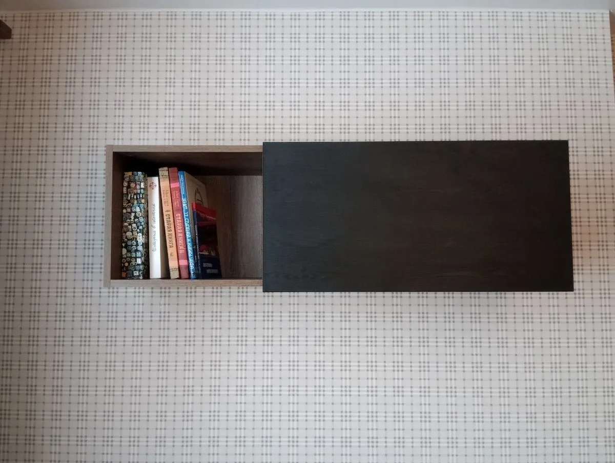 Навесная полка имеет каркас в цвете монастырского дуба и декорирована стильной черной дверцей. Она подходит современным интерьерам в стиле лофт, минимализм и хай-тек. Это практичное решение для тех, кто хочет сэкономить площадь и приобрести вместительную систему хранения с неограниченными дизайнерскими возможностями.
