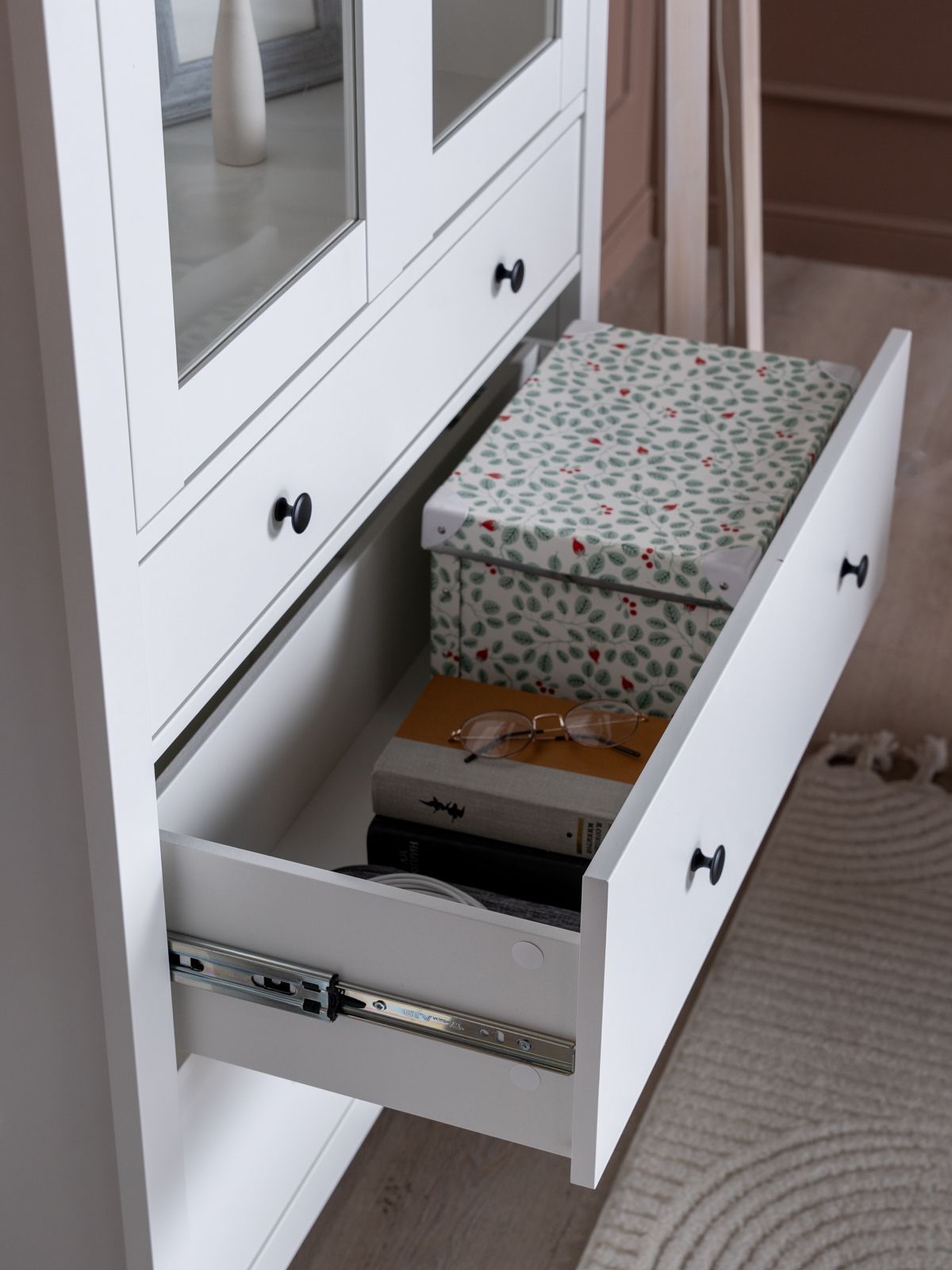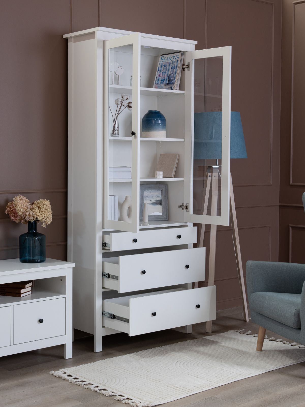 САГА шкаф с витриной 90? Шкаф с витриной САГА — это элегантное и функциональное решение для хранения, которое идеально сочетает в себе стиль, практичность и продуманный дизайн. Стеллаж оснащен тремя вместительными полками, регулирующимися по высоте, что позволяет гибко организовать пространство для хранения книг, посуды, декоративных элементов, фоторамок или других вещей. Дополнительно стеллаж оборудован тремя выдвижными ящиками, которые идеально подходят для хранения тех предметов, которые вы предпочитаете держать вне поля зрения. Ящики оснащены доводчиками и направляющими полного выдвижения, обеспечивающими плавное и бесшумное открывание, а также максимальное удобство в использовании. Благодаря такой продуманной конструкции, вы сможете легко адаптировать стеллаж под свои нужды и поддерживать порядок в доме.
