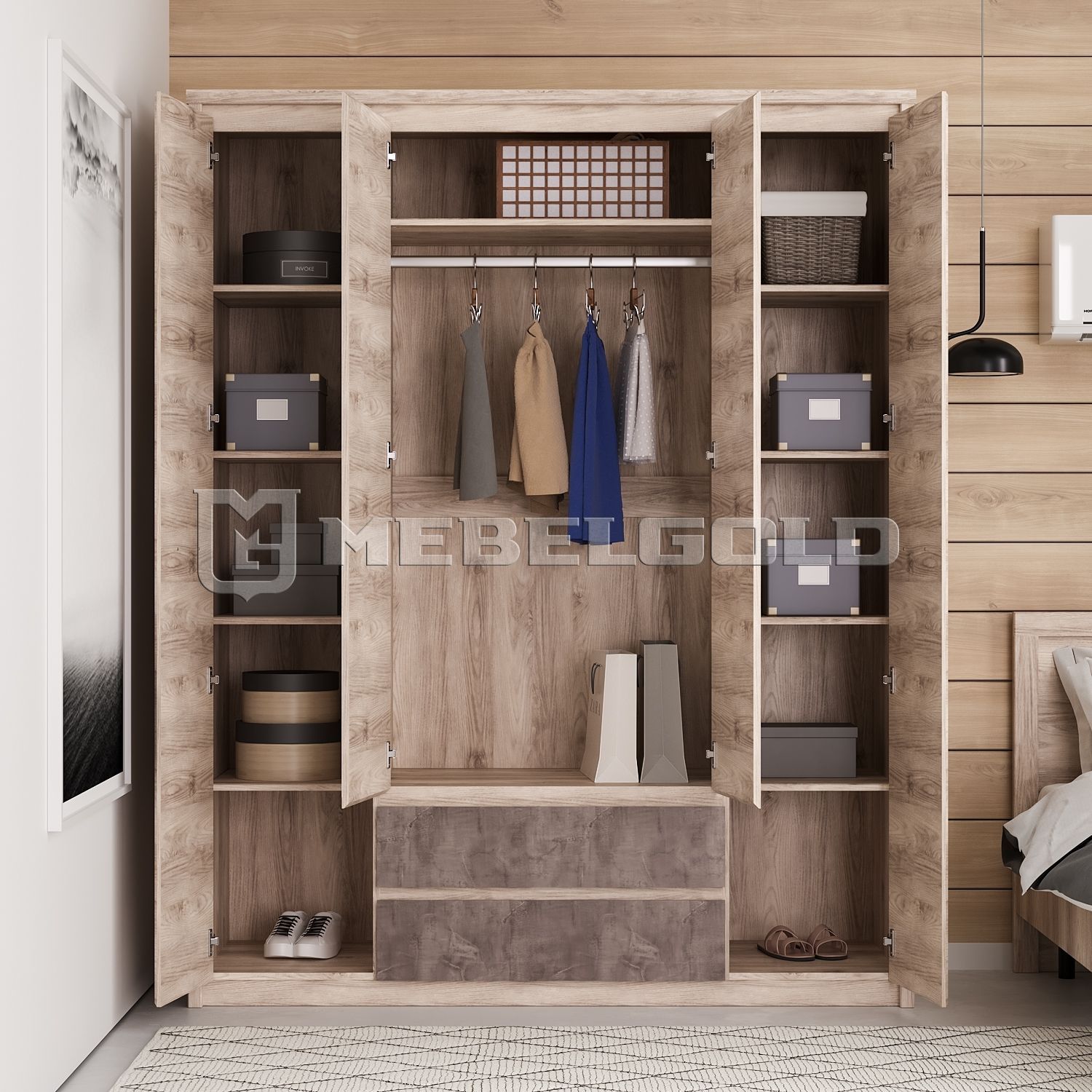 Шкаф JAZZ 4DG2S Z из ЛДСП содержит сразу несколько систем хранения: штанга, антресоль, два ящика и восемь полок. Такая модель шириной 166 см и глубиной 59 см легко уместит внутри белье и длинную одежду на вешалках. В ее ящиках можно хранить мелкие вещи типа ремней, носок и перчаток. Полки легко переставляются по высоте.