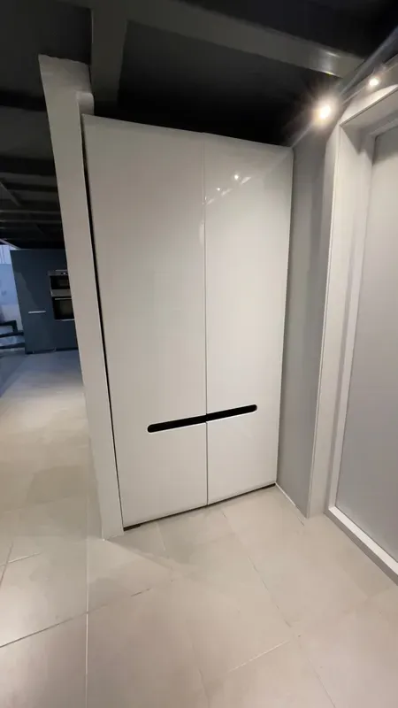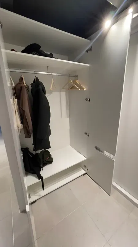 Эта универсальная мебель с секционными полками и металлической штангой идеально приспособлена для хранения белья, сезонной одежды и платьев. Ее сдержанный дизайн дополняют интегрированные ручки. Они не выходят за пределы мебельной дверцы и создают ощущение гладких фасадов. Белая глянцевая поверхность, дополненная коричневой вставкой и ножками такого же цвета, выглядит потрясающе. Убедитесь сами!