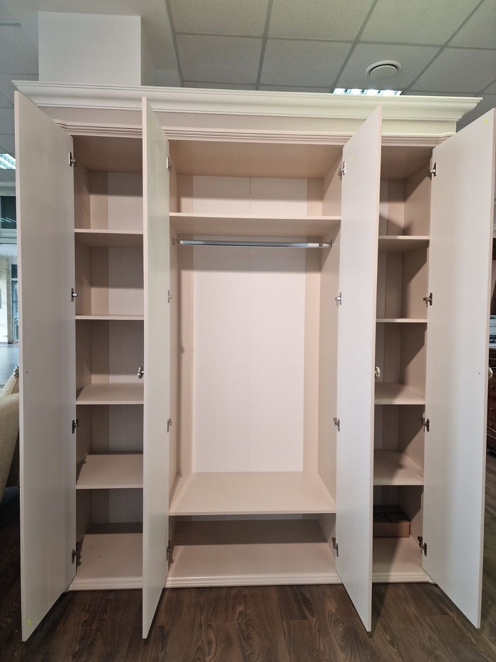 Внутреннее наполнение: 1+2+1+1 (в 1-ой и 4-ой секции 4 полки + штанга, во второй и третьей секции 2 полки + штанга)
