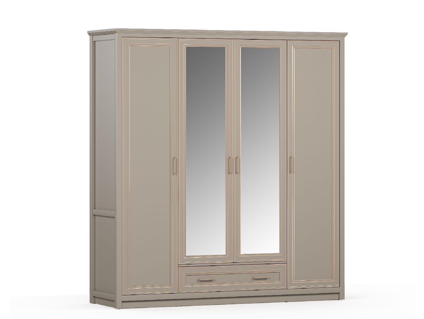 Четырехдверный шкаф глиняно-серого цвета Classic с матовым покрытием предупреждает быстрое загрязнение поверхности. За ней легко ухаживать: не требуются частые уборки и специальные средства. Фасады шкафа имеют шикарный вид, дополненный эффектным золочением, высокими ножками и ручками под медь.