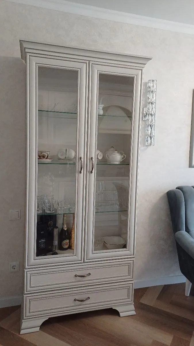 Белорусский шкаф с витриной Tiffany от производителя Anrex – это классическая модель 2V2S со стеклянными распашными дверями. Конструкция надежная и устойчивая благодаря широким ножкам и правильному соотношению размеров. Ее высота составляет 212 см, ширина – 99 см и глубина – 39 см. Модель с такими параметрами гармонично разместится в узком пространстве комнаты и станет красивой частью гарнитура. Как вариант, ее можно использовать отдельно, установив у стены или в другом месте.