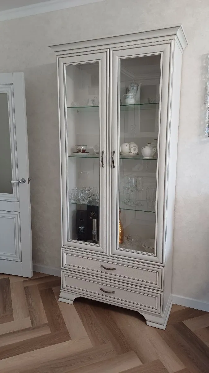 Классический шкаф с витриной Tiffany с филенками и элементами состаренности – это новый взгляд на привычную мебель и отличный способ продемонстрировать красоту вещей.