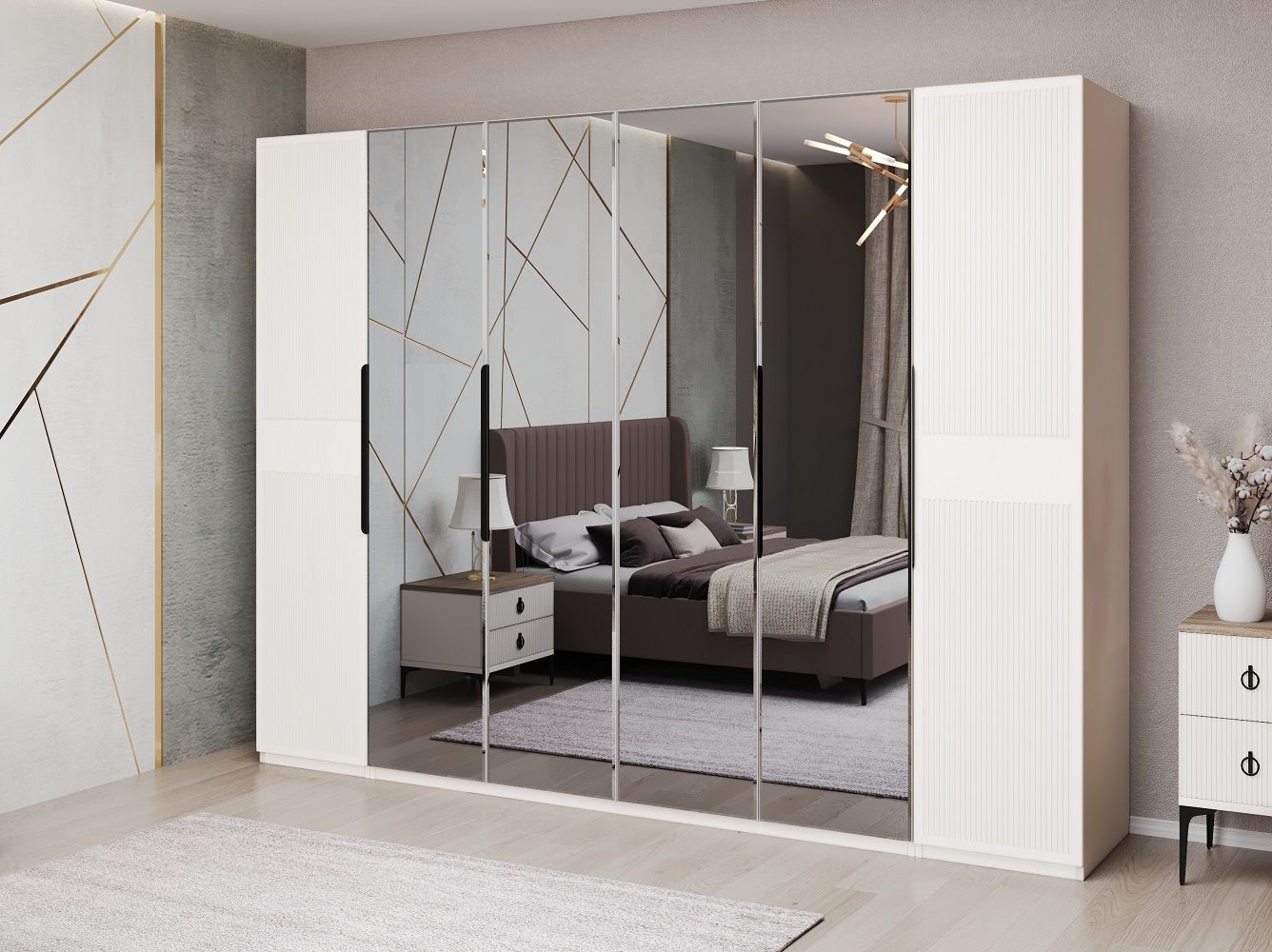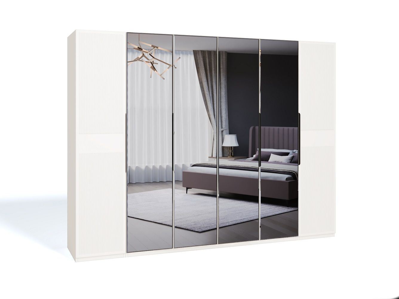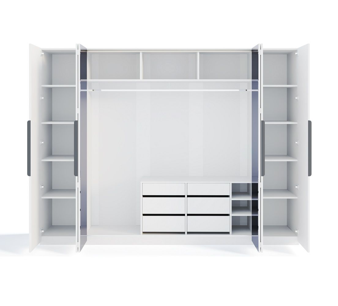 Завершают коллекцию вместительные шкафы "Стелла" которые представлены в 2х размерах — 4х и 6ти дверный. Складной механизм фасадов экономит место, плавная эргономичная форма ручки рейлинга позволяет удобно пользоваться шкафом, стандартное внутреннее наполнение с 2мя функциональными комодами, полками и штангой сохранят ваши вещи в порядке .