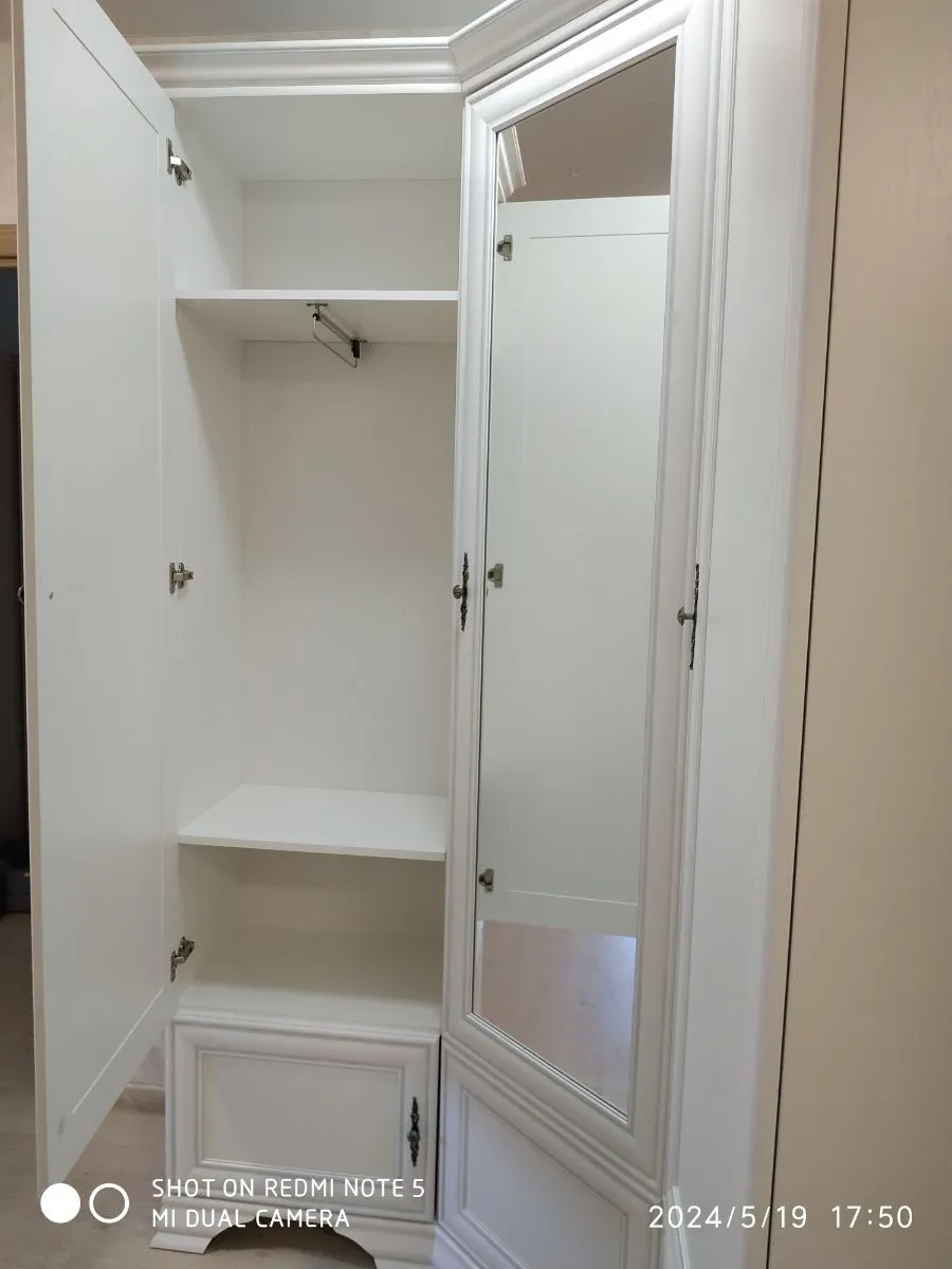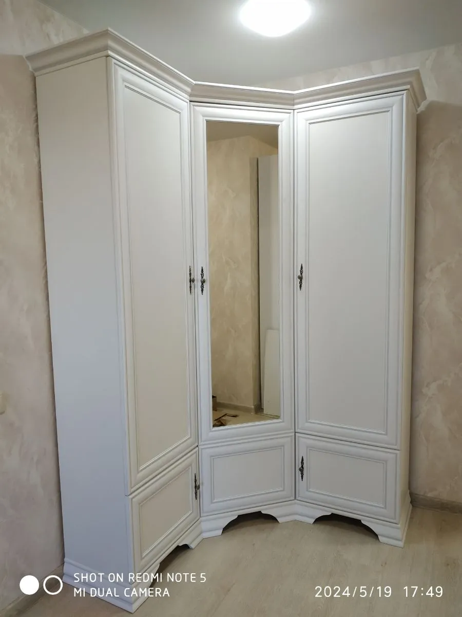Белый угловой шкаф с зеркалом Kentaki – дизайнерское решение для классических, неоклассических и современных интерьеров. Открыв его дверцу, вы увидите вместительную нишу глубиной 136,5 см и высотой 225 см. Это отличный вариант для хранения длинных платьев, коротких пиджаков, головных уборов и пледов.