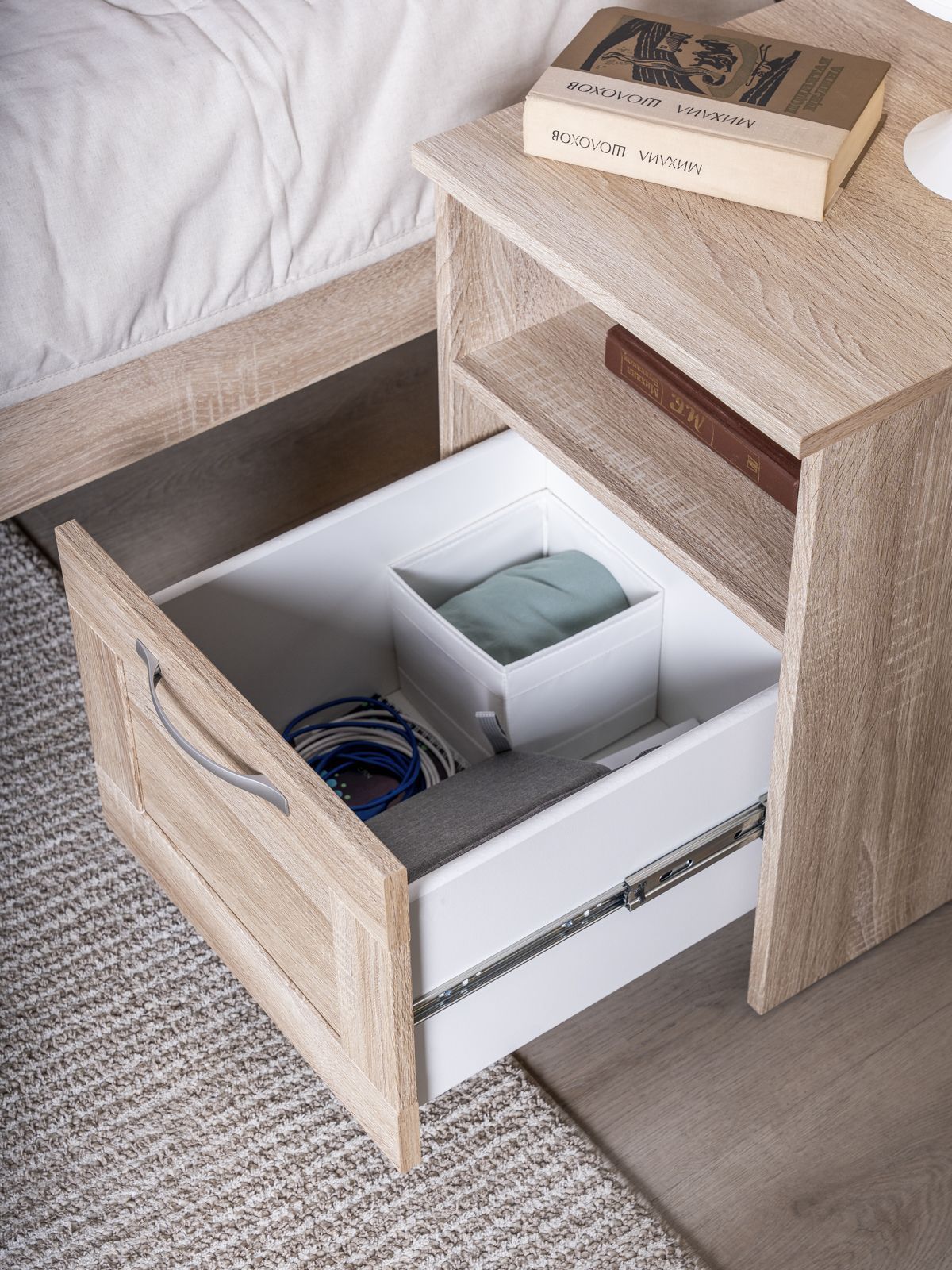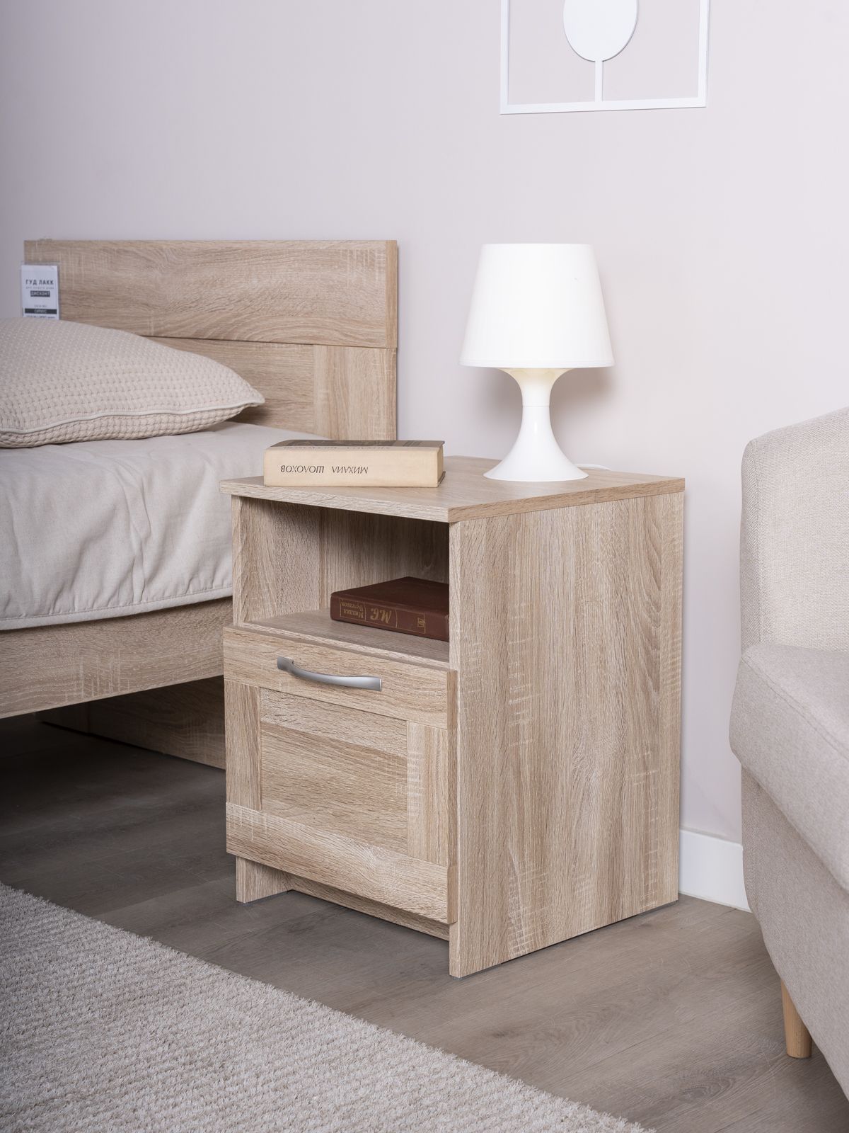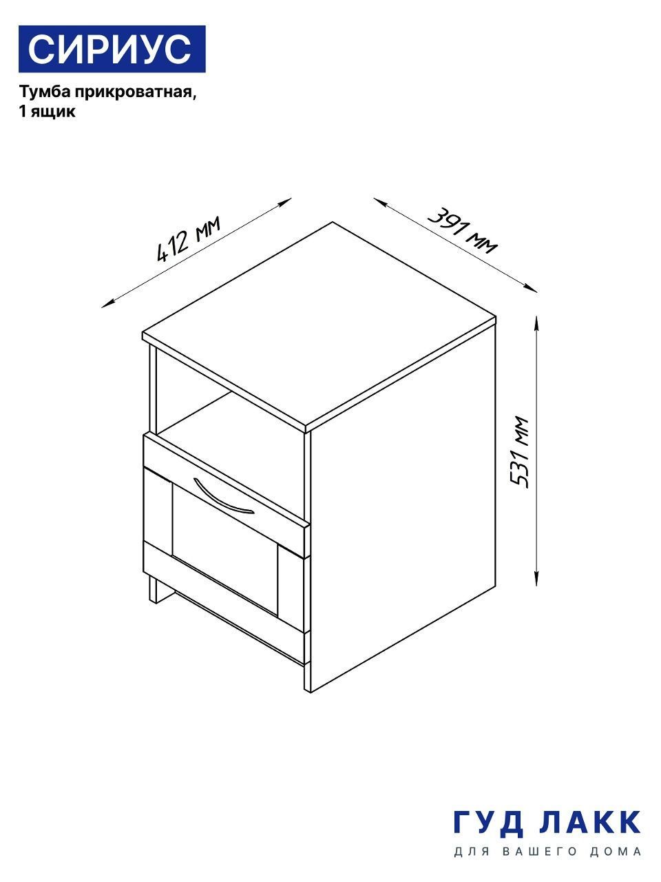 ГУД ЛАКК - знакомая мебель, которую легко купить и собрать! Прикроватная тумба СИРИУС— элегантность и качество в каждой детали! Серия мебели СИРИУС вдохновлена популярной серией BRIMNES от IKEA, и станет идеальным дополнением вашей квартиры. Лаконичный дизайн комодов гармонично впишется в любой интерьер, а компактные размеры не займут много места. Почему выбирают прикроватную тумбу СИРИУС? Тумба СИРИУС — это элегантное и функциональное решение для прикроватного хранения, которое сочетает в себе стиль и практичность. Ее главная особенность — две открытые полки, которые позволяют удобно разместить всё, что нужно под рукой. Верхняя полка идеально подойдет для светильника, создающего уютную атмосферу для чтения, кружки утреннего кофе или телефона на зарядке. Нижняя полка станет удобным местом для книги, планшета или других мелочей, которые должны быть всегда в доступе. Дополнительно тумба оснащена вместительным выдвижным ящиком, где можно спрятать то, что используется реже, например, вкусняшки, аксессуары или важные мелочи. Небольшие габариты тумбы делают ее компактной, но при этом она остается очень вместительной. Ее лаконичный и стильный дизайн позволяет использовать ее не только у кровати, но и в любой другой комнате: в гостиной — для хранения пультов и аксессуаров, в прихожей — для ключей и мелочей. Тумба СИРИУС — это не просто мебель, а настоящий помощник в организации пространства. Она сочетает в себе удобство, элегантность и универсальность, делая ее незаменимым элементом вашего интерьера. Где бы вы ее ни поставили, она пригодится везде! УЗНАВАЕМЫЙ ДИЗАЙН В СТИЛЕ СКАНДИНАВСКОГО МИНИМАЛИЗМА. Комод с филенчатым фасадом — это элегантное решение, которое добавляет изысканности, и может использоваться в любых интерьерах. Удобные ручки без острых краев одновременно элегантны и безопасны. Утопленная нижняя планка добавляет комоду легкости и воздушности. ВМЕСТИТЕЛЬНЫЕ ЯЩИКИ. Здесь удобно хранить книги, гаджеты и аксессуары для них, украшения, или мелочи, и многое другое, что обязательно должно быть у Вас под рукой. Тумба МАЛЬТА – это маленькая Нарния). ЭКОЛОГИЧНОСТЬ. Наша мебель производится на заводе полного цикла по принципу «от древесины до готового изделия». При этом применяются максимально жесткие требования к экологичности на уровне, установленном для детской мебели. КАЧЕСТВО НА УРОВНЕ IKEA. Тумба СИРИУС изготовлен на сертифицированной фабрике в Беларуси, которая ранее производила мебель для шведского бренда. Кстати, в том числе поэтому наш ассортимент прекрасно сочетается с мебелью ИКЕА, которая, возможно, есть у Вас дома. Сочетается как по дизайну, так и за счет совпадения цветовой гаммы. ЛЕГКОСТЬ СБОРКИ. Вы можете сами легко и быстро собрать нашу мебель, что позволит сэкономить и время на ожидание сборщика, и деньги на оплату его услуг. А поможет в этом не только высокое качество изготовленной мебели, но и понятная пошаговая инструкция. Кстати, если вы вдруг потеряли инструкцию, ее всегда можно скачать здесь, в карточке товара. НАДЕЖНОСТЬ. Несмотря на то, что гарантийный срок на мебель по закону составляет 24 месяца, реальный срок службы нашей мебели составляет до 20 лет. Уж поверьте, сменить обстановку вы решите гораздо раньше, чем выйдет из строя наша мебель. Мы хорошо знаем жизненный путь нашей мебели. Из Вашей кварти