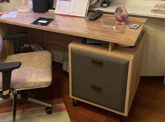 Столешница удлиненной формы имеет ширину 134 см и глубину – 55 см. Это позволит успешно разместить на ней ноутбук, канцелярию и необходимые рабочие материалы. Модель изготовлена из ламинированной плиты ДСП и МДФ, которая с максимальной точностью передает красивый древесный рисунок под дуб наварро и окрашивает ящики в насыщенный графитовый цвет. Установленные в них шариковые направляющие Quadrо упростят их открывание и закрывание, а также продлят срок службы мебели.