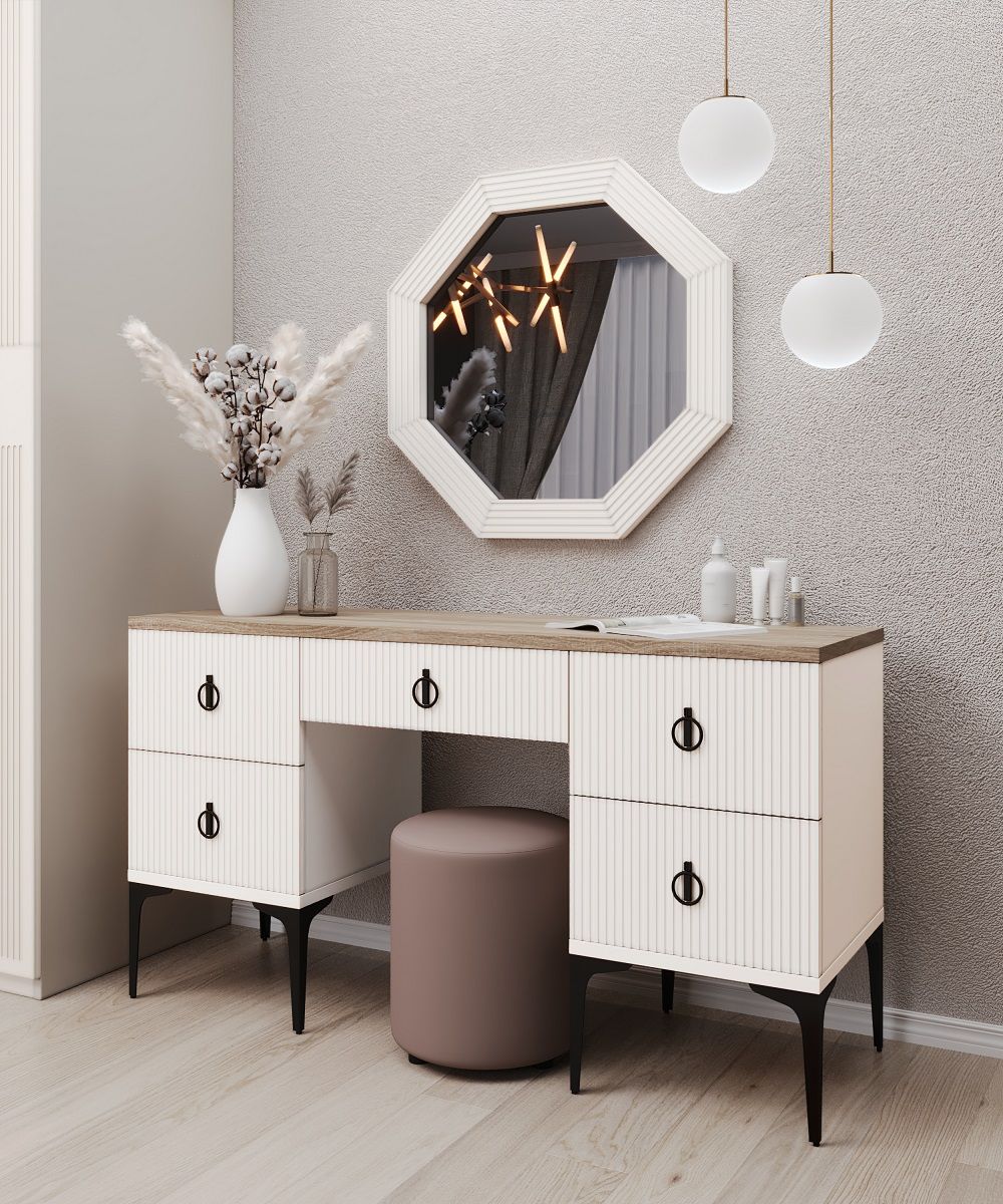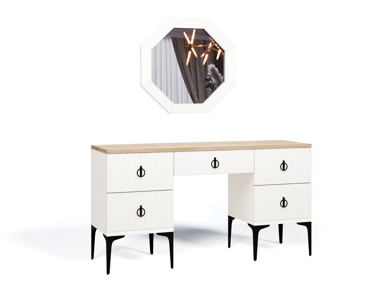 Туалетный стол "Стелла" придает интерьеру особый современный шарм. Просторная столешница и удобные выдвижные ящики, оснащенные доводчиками, обеспечивают максимальную функциональность и комфорт в вашей спальне такой столик можно использовать как косметический в паре с зеркалом, так и как рабочий стол для студента или школьника. Мягкий стильный пуф является дополнением к туалетному столу