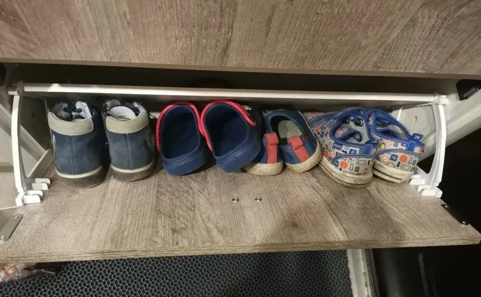 При разработке модели белорусский бренд БРВ-мебель уделил основное внимание ее вместительности и создал конструкцию с тремя откидными дверцами. Они открываются легко, одним движением руки и закрываются плотно благодаря надежной фурнитуре немецкого производителя Hettich. Тем самым глухие створки защищают обувь от пыли и влаги.