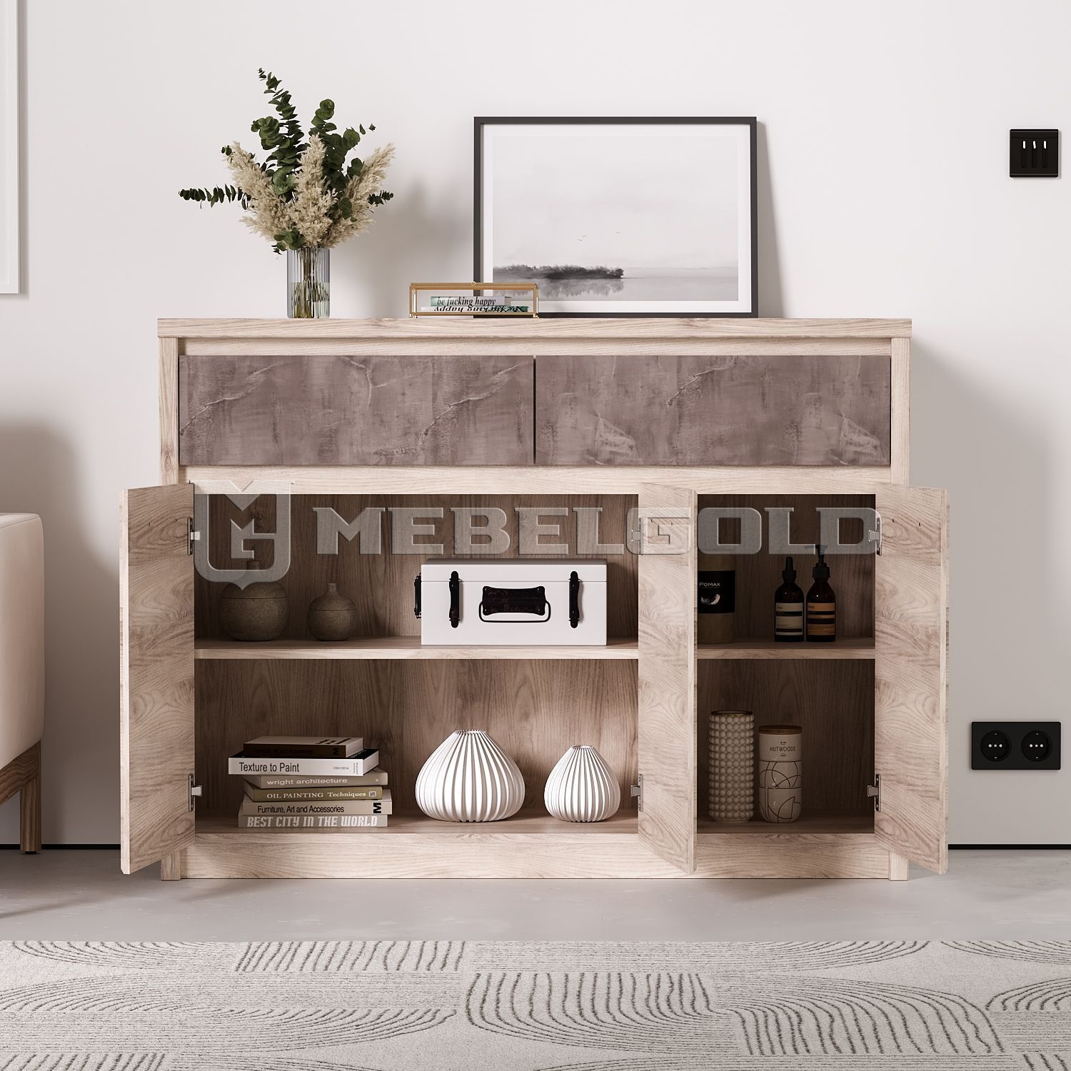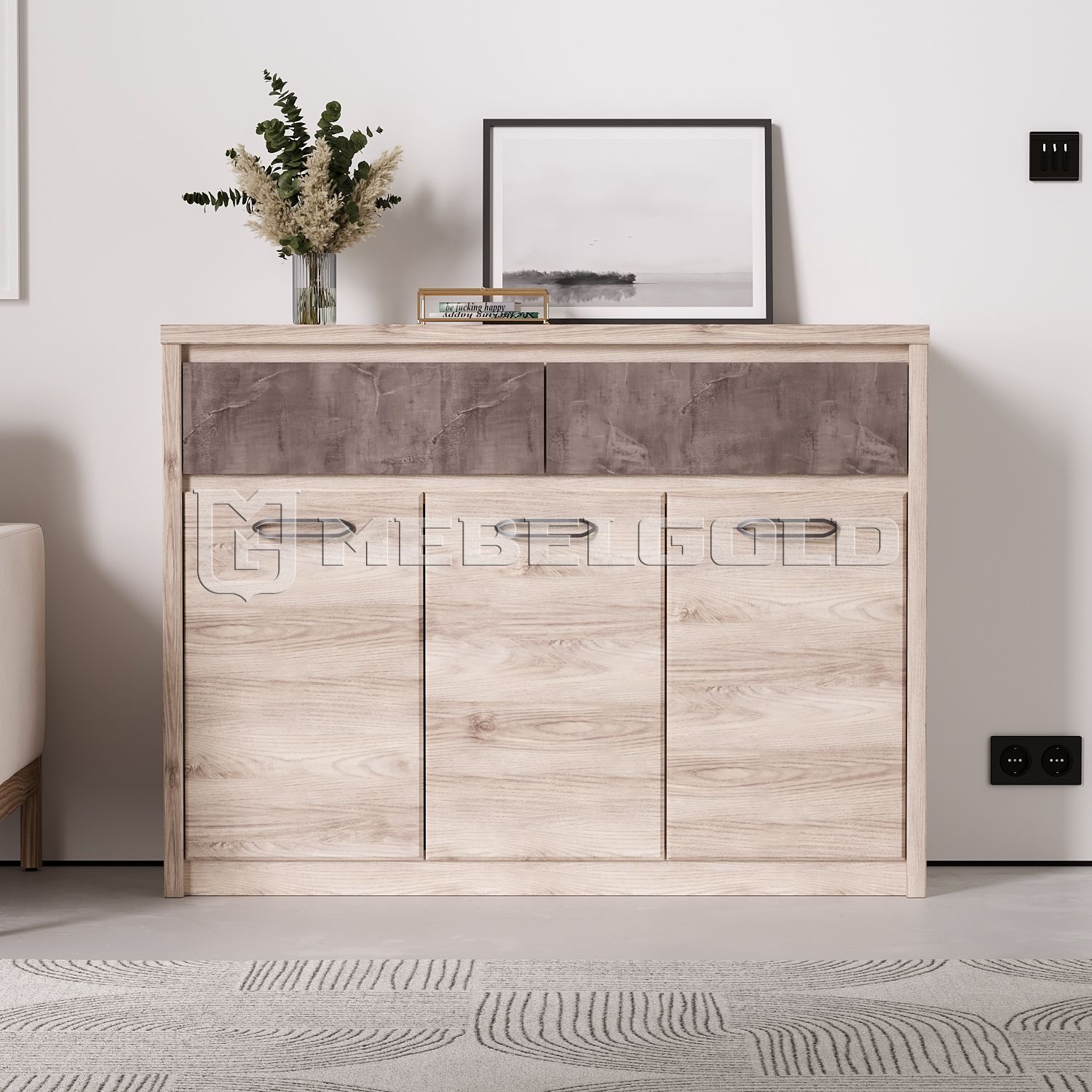 Широкая напольная тумба JAZZ 3D2S из ЛДСП имеет вид эксклюзивной мебели, сделанной из дерева. Естественность ей придает ламинированное покрытие, имитирующее узоры натуральных волокон. Прямая тумба «Джаз» подходит для наполнения спален и прихожих стиля модерн, минимализм, хай-тек.
