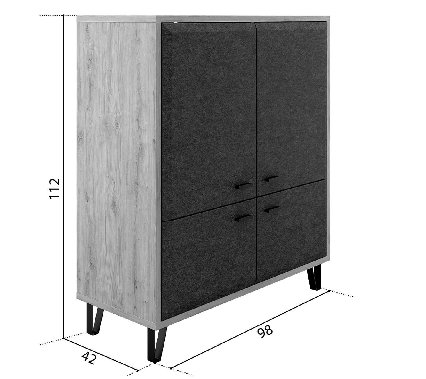 Тумба Grace представлена оригинальной моделью с четырьмя распашными дверцами разного размера. Это визуально легкая и стильная конструкция на металлических ножках имеет высоту 111 см, ширину 97 см и глубину 41 см. Благодаря таким размерам, она компактно разместится в небольшой комнате и даже заменит небольшой шкаф.