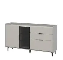 Тумба с тремя выдвижными ящиками; одной глухой распашной дверью и одной распашной витриной из алюминиевой рамки профилем 20х20мм, цвет: чёрный брашированный с тонированным стеклом; две стеклянные полки с тонированным стеклом бесшумными направляющими с доводчиком; петли плавного закрывания