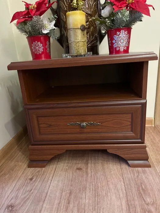 Прикроватная тумба каштановго цвета Kentaki – это классическая конструкция на ножках с открытым отделением и выдвижным ящиком на роликовых направляющих. Небольшая по высоте модель (47 см) прямоугольной формы и ширины 55 см идеально встанет вровень с кроватью и создаст привычные удобства. Установите ее на уровне вытянутой руки и пользуйтесь, не вставая с постели.