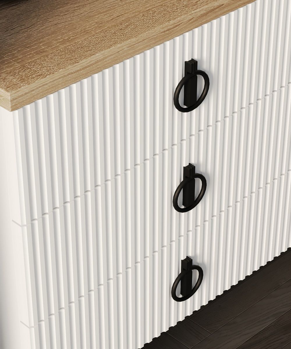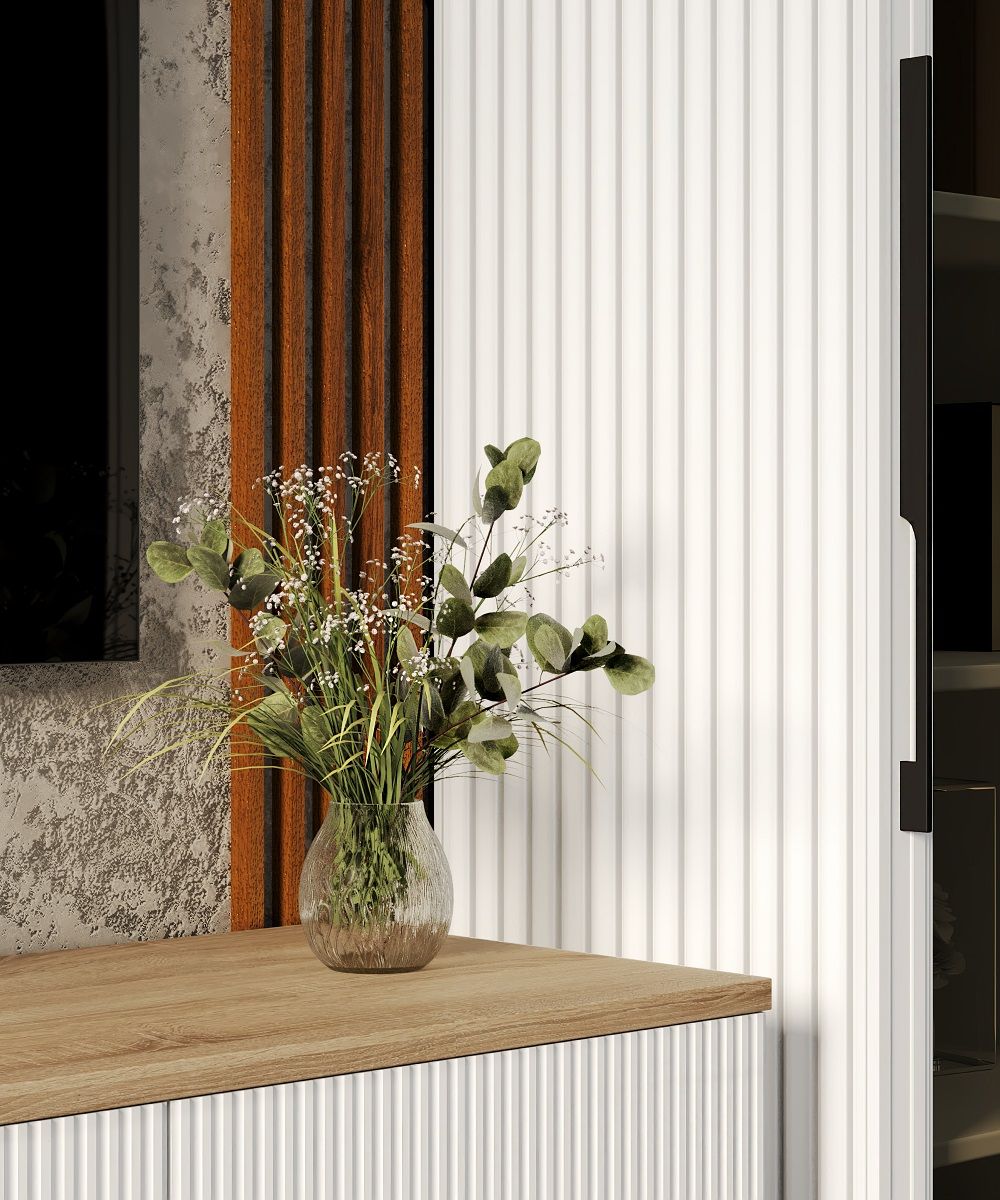 Каждая деталь тщательно продумана, чтобы подарить вам не только максимальный комфорт и эстетическое удовольствие, но и уверенность в высоком качестве мебели. Корпуса и столешницы модулей выполнены из ламинированной древесной плиты европейского качества, Фасады из природного МДФ задекорированы рельефной фрезеровкой и авторский стиль фабрики ЭРА — это финишное покрытие матовая итальянская эмаль ярко серого цвета.