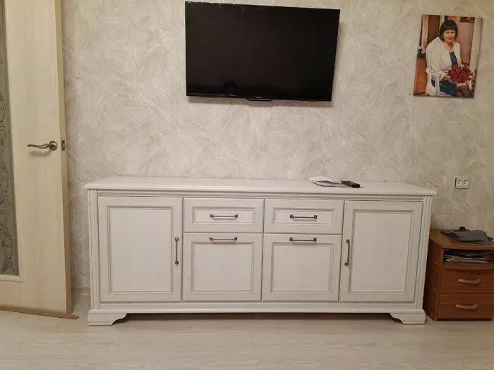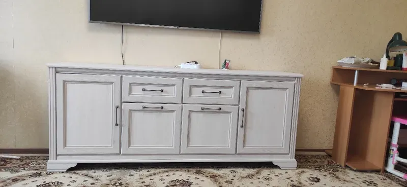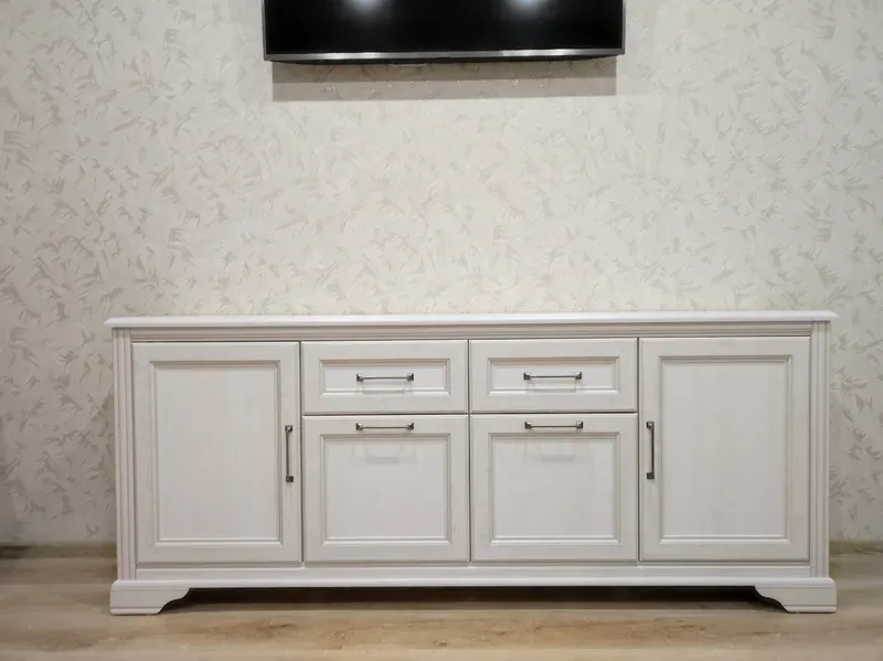 Модель укомплектована двумя выдвижными ящиками и четырьмя глухими дверцами. Это прекрасный вариант для узких гостиных и длинных детских комнат. Гармоничнее всего она смотрится у стены в комплекте с мебелью в аналогичном дизайне.