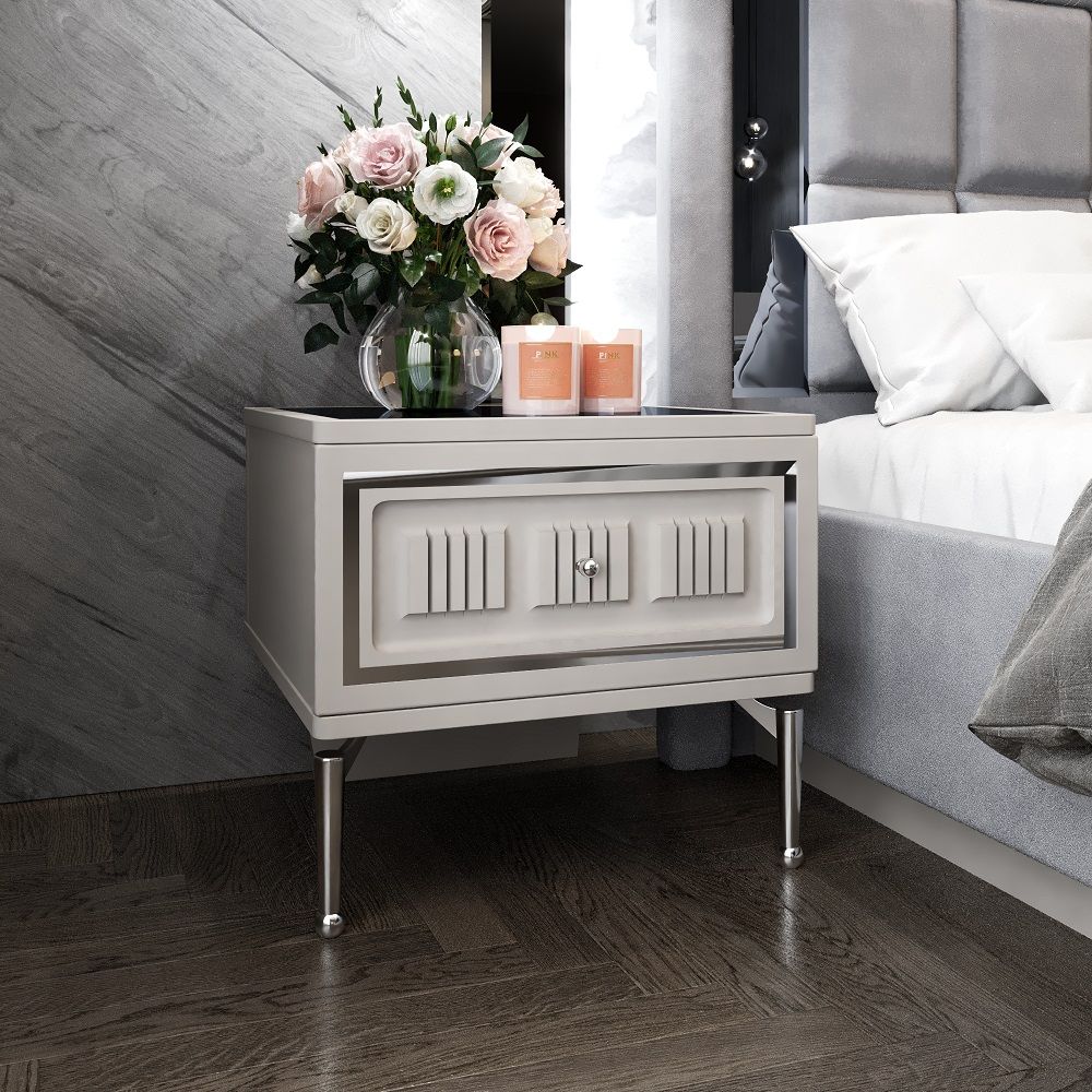 Прикроватные тумбочки с эффектом парения, туалетный стол на лёгких металлических опорах с топами из крашеного итальянской эмалью МДФ с модным декором стеклянной бронзированной поверхностью выгодно подчеркнут стиль спальни. Спальня оснащена современными европейскими механизмами с доводчиками.
